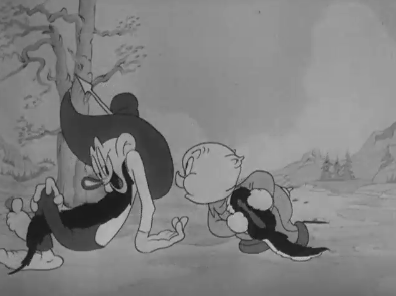 Enter Porky, clad in a coonskin cap as he gallops along on his horse. Right off the bat, the horse’s design deserves commending. This cartoon has two subsets of animation—off the walls, rubbery animation, and realistic, highly-detailed animation pertaining to the horse specifically. Compare the limber legs and defined features to the horses in Porky’s Phoney Express, who were nothing but spheres glued together. What an amazing development—and the physics of the horse look fantastic in motion!
