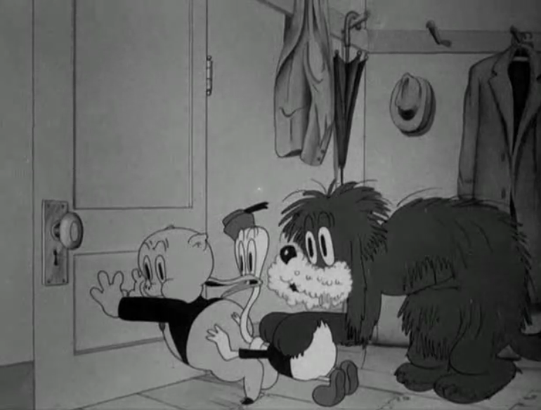 Porky and Goosey whip past the penguin, Porky still shrieking about the mad dog. The penguin wastes little time putting the coat rack into place, it’s ornaments floating in the air the entire time.