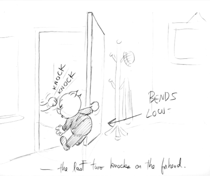 Recalling his previous incident of getting konked on the noggin, Porky opens the door slowly, ducking low to the ground in case his visitor is feeling particularly punchy.