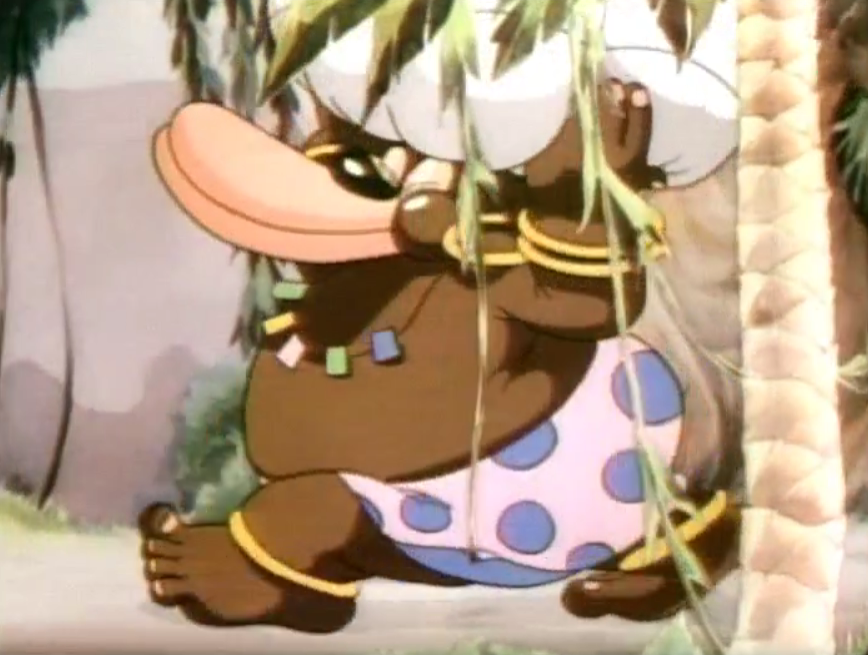Enter a gag re-used from Buddy's Circus, both jokes equally dehumanizing as the native opens his lips to reveal a record spinning inside his mouth. He adjusts his needlepoint tongue, closing his lips and pausing to listen as the record readjusts itself.