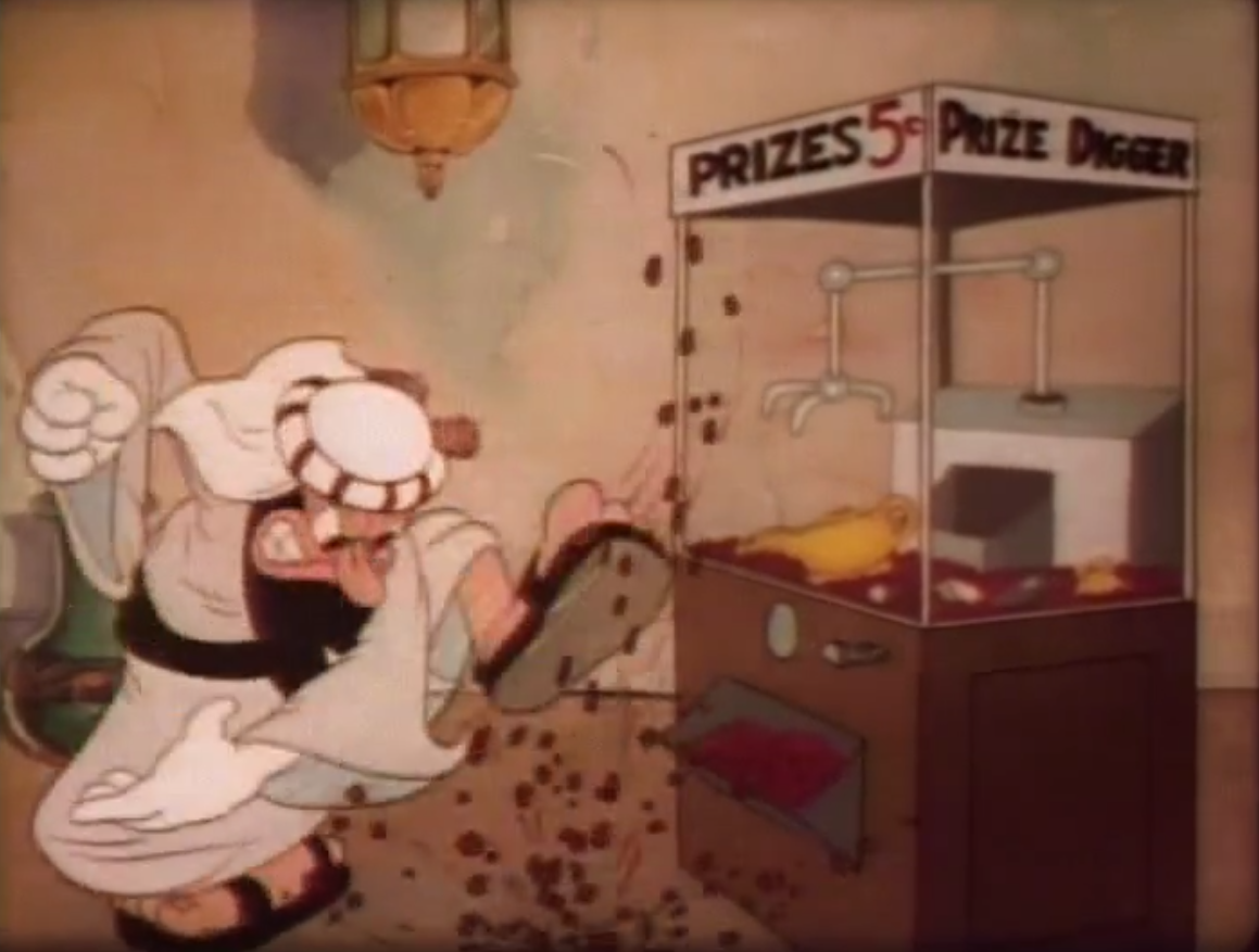 Carl Stalling's situational music score of "I Wanna Go Back to Bali" turns from foreboding to playful and sympathetic, transitioning to major key as the claw grabs a handful of jellybeans filling the bottom of the machine and tosses them into the chute.