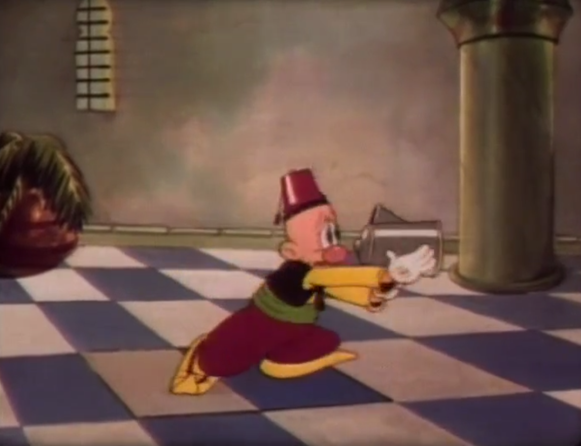 No longer a cowboy or a hunter, Egghead is now cast as a peasant roaming the streets of Bagdad. In spite of stereotypes abound (such as a beggar on the streets moaning gibberish), the attitude of the short is swiftly constructed by Egghead's giant smile and curious stares at his surroundings. He doesn't say a word, but it's evident he's an incongruent asset to the streets he roams, and his eager impressionability will likely result in trouble.