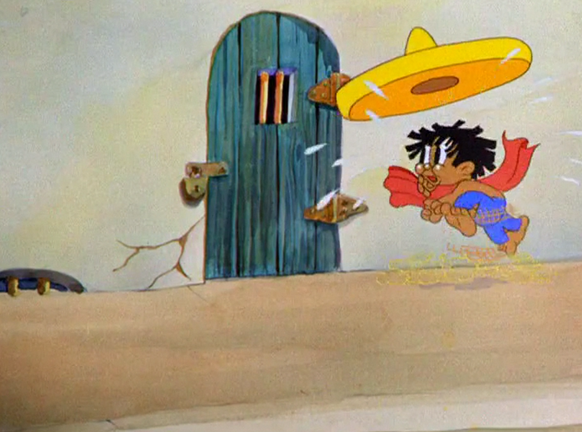 Seeing as this is a cartoon, all exits must be as unconventional as possible. Pancho peers out of the man-made door in the sombrero, observing the crowd with a grin. His dreams of becoming a bullfighter have come true.