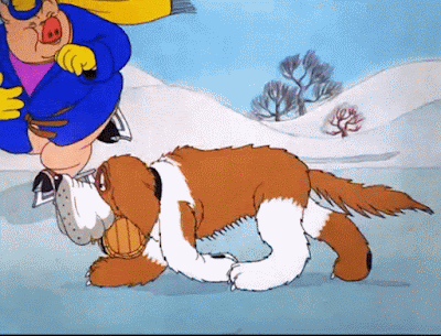 Fade out and iris in to the St. Bernard pacing the pond to a bloated motif of "Where, Oh Where Has My Little Dog Gone?" With a shaky truck-out, the camera zooms out to reveal Squeals hiding behind a conveniently placed tree in the ice. It is certainly difficult to follow the same standards set in place by McKimson's animation, and that struggle is felt in the design of Squeals (or rather, the disconnect spawned by it). With smaller eyes, lower ears, bigger cheeks, and a rather wrinkly, elongated snout, Squeals is much less appealing than McKimson's Squeals.