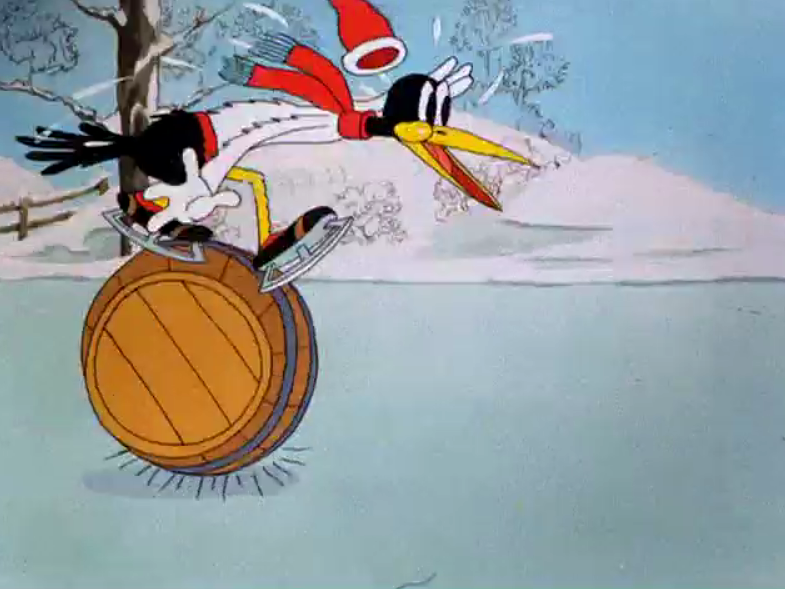 Set to the tune of "The Blue Danube", a chorus sings skating appropriate lyrics on top of various animal antics. Frank Tashlin gets creative with the transitions; the establishing shot is an opaque red color card, which is soon revealed as the pants of a skating elephant. The elephant circles his fellow skaters (hippos, rabbits, penguins, dog-adjacent creatures) before skidding right into the foreground, coloring the screen red again.