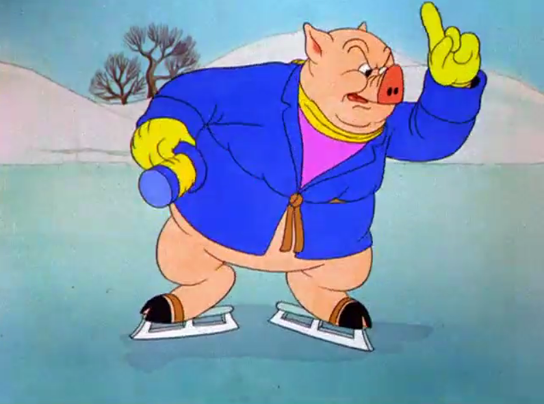 In many cases, the cartoon's song number can serve as a detriment (and the directors were very vocal as such, resulting in their eventual obsolescence.) Here, however, the short's opening number of "The Blue Danube" works in its favor. Squeals now finds himself the unwilling participant of a skating content, bouncing along the ice at rocket speeds to a triumphant score of the same song, which essentially puts the number as a book-end.