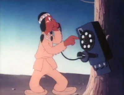 ...gallop two inches, that is. Slightly Daffy borrows the same Avery-ism of the man dialing the rotary phone, which, even then, isn't entirely of Avery's creation. The Van Beuren Cubby Bear cartoon Indian Whoopee from 1933 also has an Indigenous man dialing a rotary phone (going the extra mile to slip a quarter in the slot). It seems the Indigenous cartoons borrow more than just stereotypes from one another. In any case, the gag is made slightly less straightforward as the phone rotates along the dial as opposed to the dial itself.