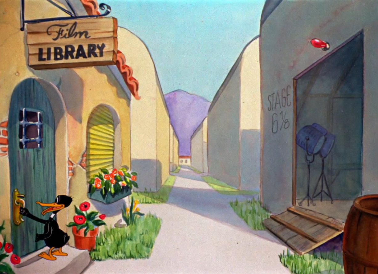 Now, Daffy's hysterics take him to the outside of the next door film library. Judging by his slight pause and subsequent skipping to the front door, trouble seems imminent.