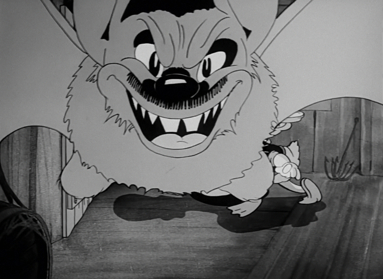 The lighting in the scene of Dizzy begging Porky to open the door is considerably lighter than the previous scenes, which serves as yet another jarring disconnect. In any case, Dizzy rips the doorknob off of its hinges, plowing the door down instead as the bear glides comically slow behind him, the frenzied music score serving as the most exciting part of the entire sequence.