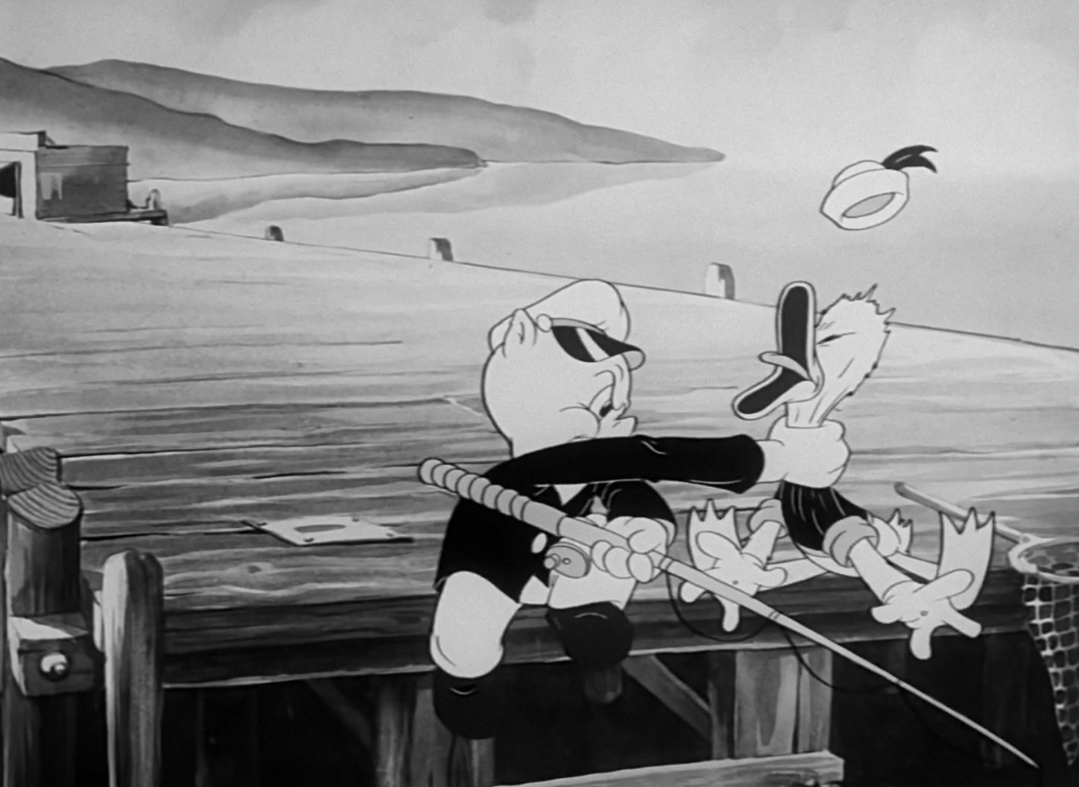 Rather than dissolving to Porky and his duck friend, the camera cuts straight back to them sitting at the dock, a rather abrupt transition between scenes and tone. Here, Porky recites the future wisdom of one Elmer Fudd: