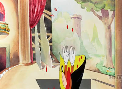 It seems we only have two deaths on the roster, not three. Elmer, in all of his Droopyesque omnipresent glory, emerges completely unharmed and unshaken from his stabbing encounter and yells a few more snatches of "She'll Be Coming 'Round the Mountain".
