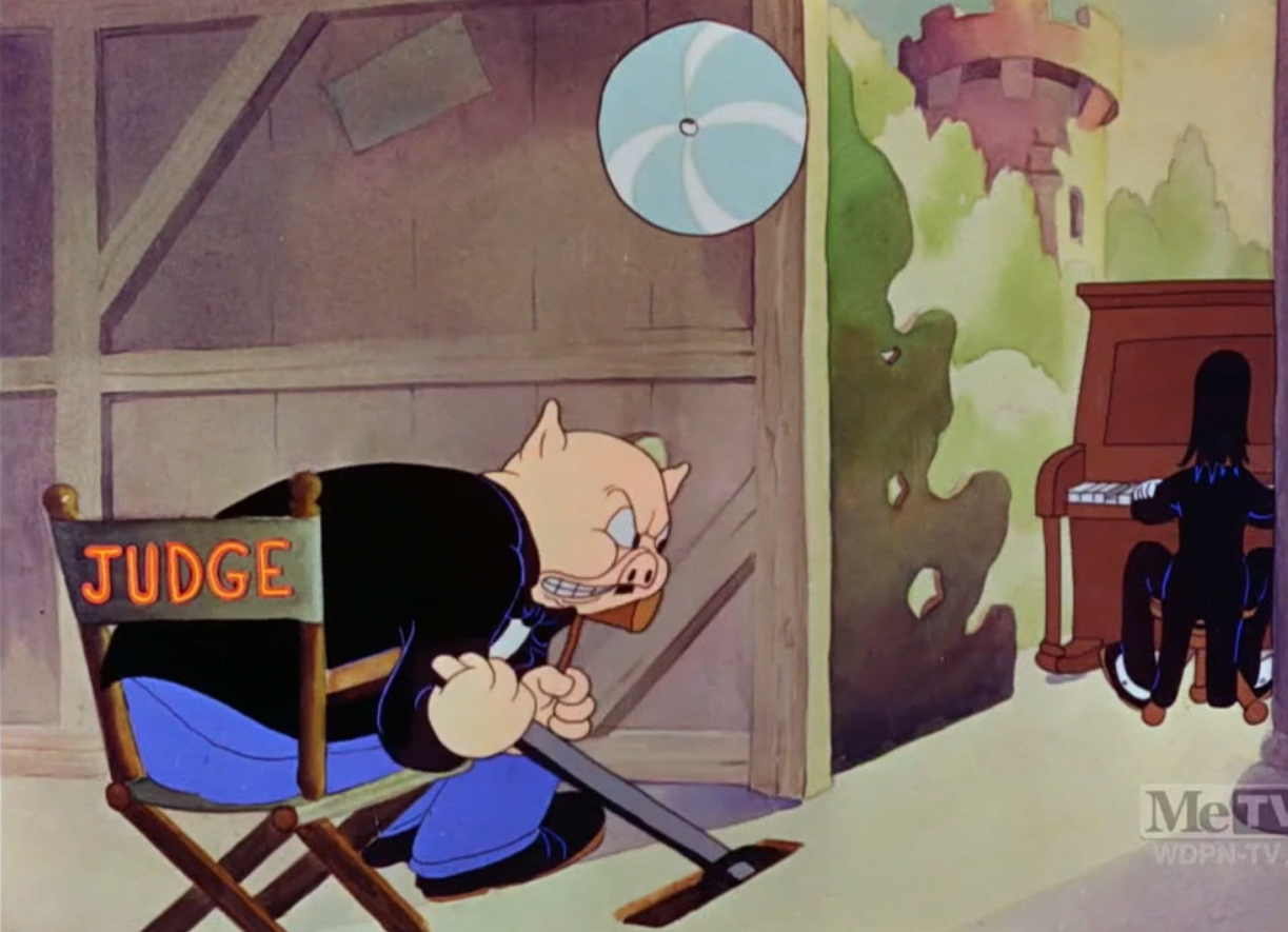 Sadly, our porcine judge doesn't display the same appreciation for Paderwiski's act. Much like the director from Daffy Duck in Hollywood, the judge is instantly recognizable by the neon declaration of "JUDGE" on the back of his chair.