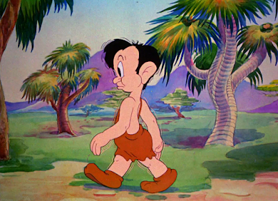 Even then, Jonesisms nevertheless persist. As most 1930s cartoons under the direction of Charles M. Jones do, we open to a long, scenic establishing pan of a prehistoric sunrise, Stalling’s muted accompaniment of William Tell's Morning Song being the only logical music score. While the pan is slow, it allows ample time for the audience to soak in the wide variety of hues in the painting; orange skies juxtapose nicely with the pale blues and purples of the mountains, emboldened by the darkness of the rocks, trees, and vines in the foreground.