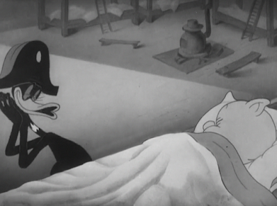 Said animator appears to be John Carey, particularly evident in Daffy’s prominently arched eyebrows, thin eyes, and glacial yet well constructed movements. A stark contrast to his earlier altercation with the bugler, Daffy’s attempts to rouse Porky are gentle and cloying as he coos “Porky… Porky…!”
