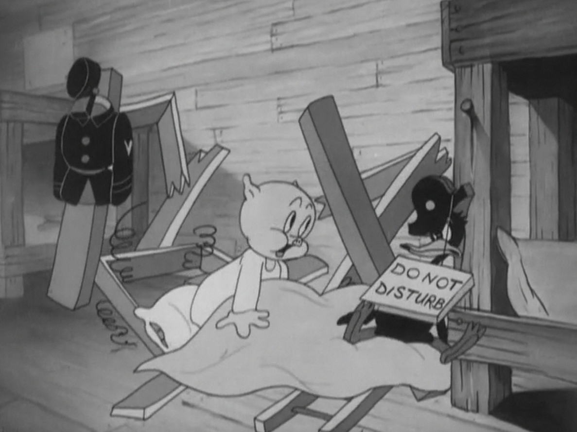 On the plus side, Porky is finally awake, casting naïve, nonplussed blinks at a disgruntled Daffy, entangled in the “DO NOT DISTURB!” sign with his hat askew. Ironically, having Porky be positioned on top of a pillow and beneath a blanket still makes it appear as though he’s in bed, which adds to the unintentional coyness of his “Who, me?” expression.
