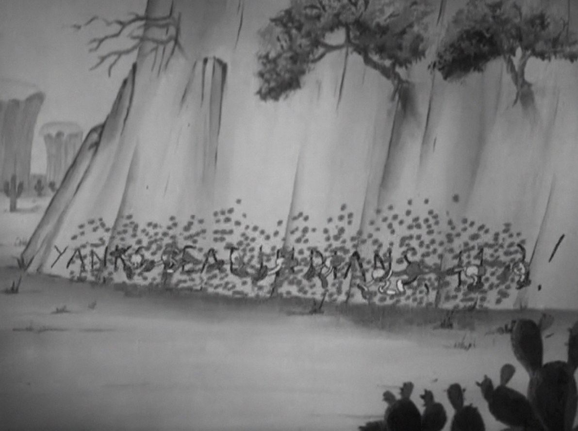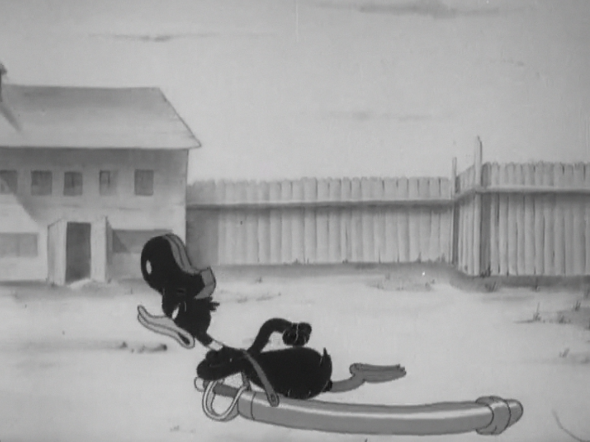 His dutiful walkabout resumes as we iris wipe to an interior shot of the post. Clampett uses a similar maneuver to one he employed in Kristopher Kolumbus Jr., where elements in the foreground are painted on their own layers and split into two opposing directions as the camera trucks in, an attempt to mimic the multi-plane camera effects most common in Disney cartoons for added dimension.