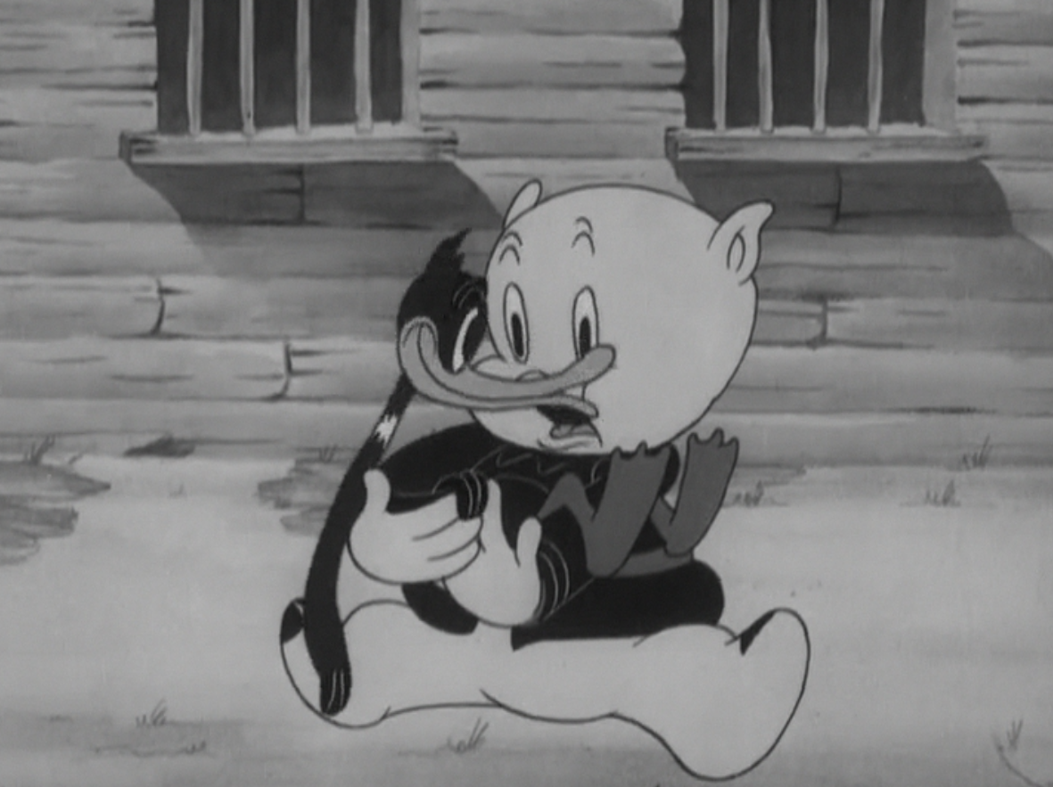 Even if this scene had been made 2, 3, 4 years later, it wouldn’t exactly have the same visceral sincerity; Daffy’s compact, cute design certainly makes for a more heartwarming watch than Porky struggling to hold the much leaner, more mature, wilier design of the ‘40s Daffy and onward. Even in this cartoon’s remake, Slightly Daffy, the effect isn’t the same with Daffy’s deeper voice and slightly more mature looks. Nevertheless, the sincerity is a welcome—if not fascinating—surprise.