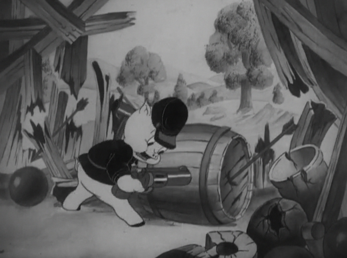 Thankfully—as has been harped on in previous reviews—Clampett knew not to inflict excessive pain on more endearing, sympathetic characters such as Porky, which is why the smack of the scabbard is more so a means of transportation than an injury. Still clinging to his harpoon gun, Porky flies back into the barracks, where the blade of the gun lodges in the floorboards.