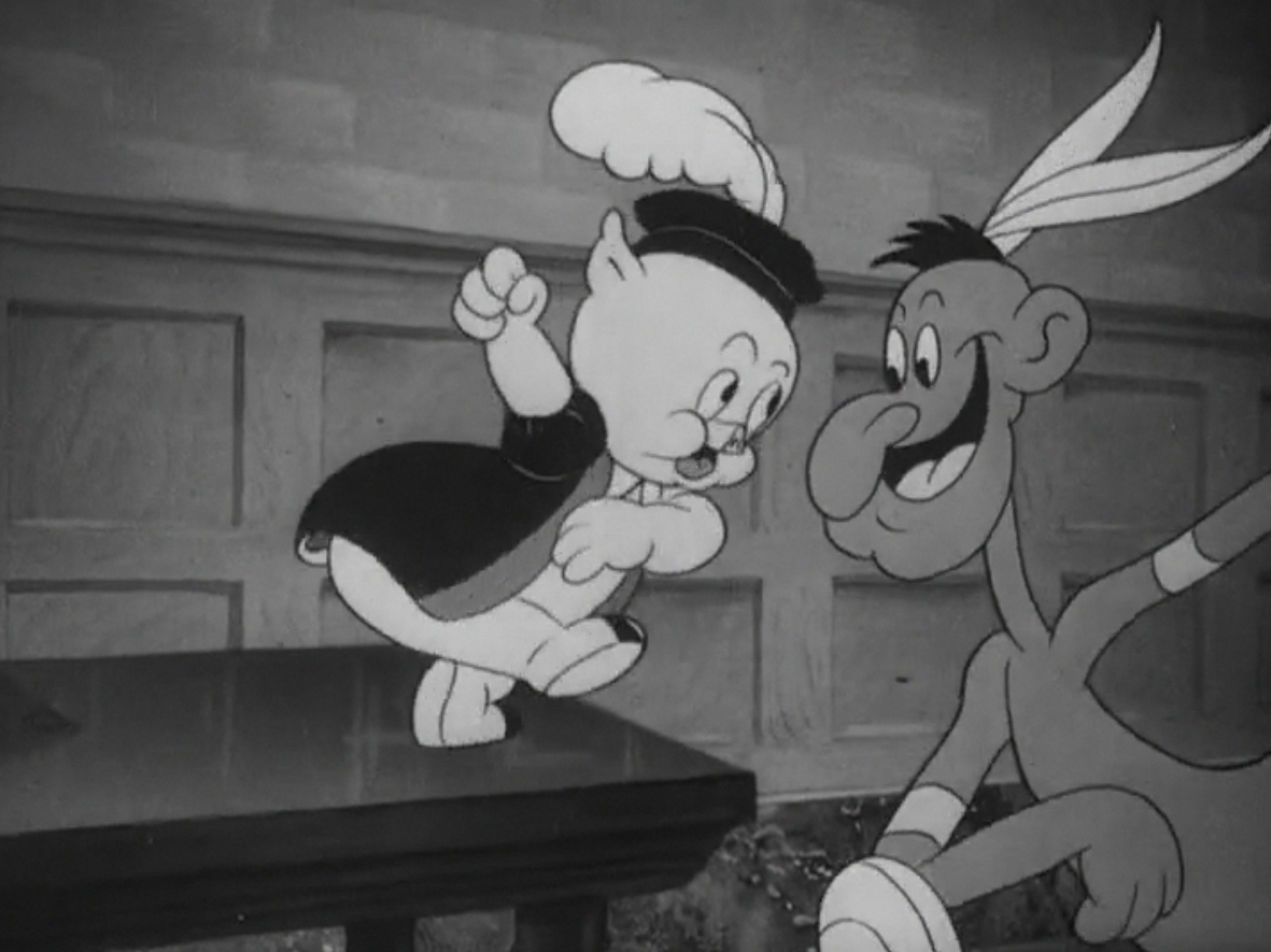 The queen is pleased, indicated by both the animation and Pierce’s narration. Composing the scene so that the queen can only be viewed primarily from profile furthers a sense of authority, stylization, as if her regality extends the logic and design of late ‘30s “funny animal” cartoons. A disconnect is obvious between the full movements of Porky and the stiff profile of the queen—contrast between human and pig furthers the juxtaposition.