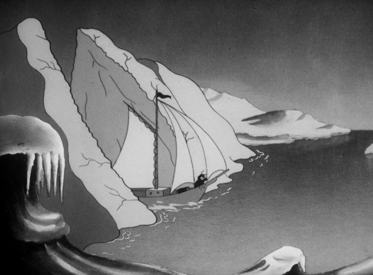 Like most Clampett cartoons of the era, Polar Pals kicks off with a series of establishing shots, any movement conveyed through a truck-in and dissolve rather than a horizontal pan.