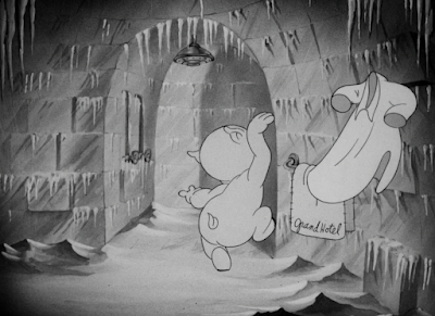 "Lighthearted over painful" is a philosophy he continues to abide by as a large icicle konks a dazed Porky on the head. Rather than bursting into tears as he did with a synonymous gag in Porky in Wackyland, he merely maintains the same stunned expression, which is particularly appealing and cute. The askew parka is a subtle but keen way to indicate that something is amiss.