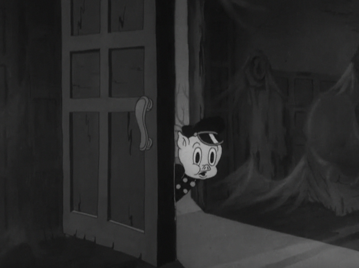 That, and serving as an avenue to pull the ol’ “curtains flapping and scares frightened protagonist” trick marked by alarmed music stings. Certainly nothing audiences haven’t seen before, but the speed in which Porky flees—even if the draftsmanship of the animation itself is relatively crude—is welcome.