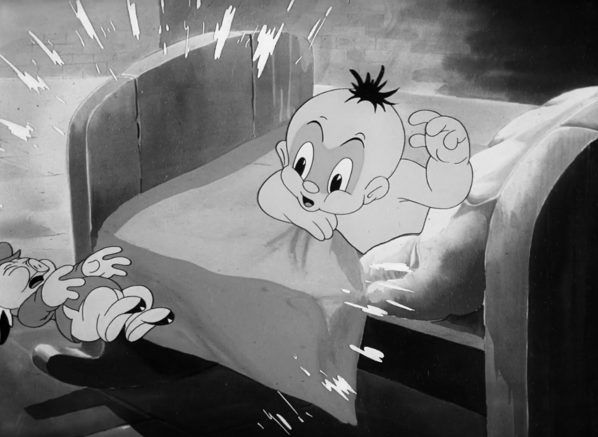 Even then, the infant doesn’t hold a grudge—the transition in tone is almost comedically jarring as he instead contentedly sucks on his assaulted finger, Mel Blanc heaving obnoxious, manly giggles in a matter of seconds.
