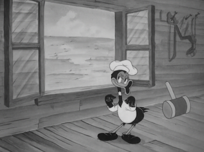 Still, this cartoon was produced in 1939, and the duck of 1939 remains loyal to his namesake. His visible surprise at the imposing authority of the customer is only temporary—a vacant, obedient grin is quick to slither back on to his face, as though representing a physical and mental shift back into gleeful hysteria.