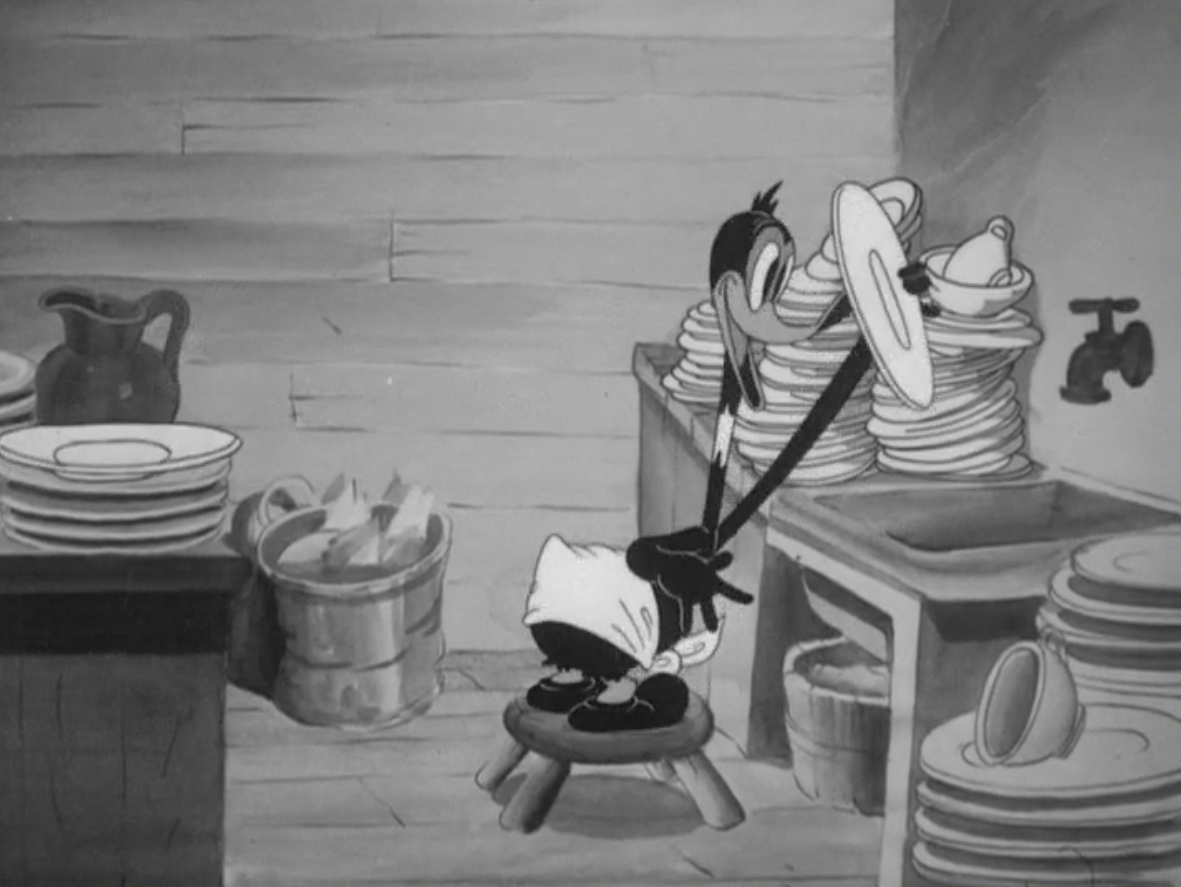 Formula has dominated the entire opening of the cartoon thus far. That is, each and every beat has subscribed to the rule of threes: two shots were dedicated to the singing hens before revealing the shrieking duckling, Porky’s own interjection was only after two beats dedicated to smacking the pancake batter. Now, Daffy dries two dishes before engaging in his next act, the punchline, the breakout.