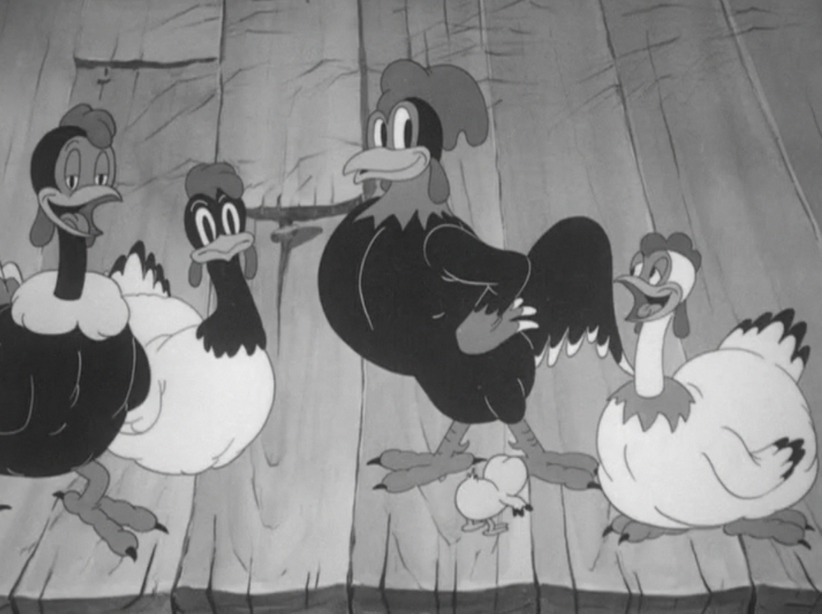 The camera truck-in—and, subsequently, the animation—to the chickens swaying back and forth singing is crude, liberties taken to accommodate for the small size at such a far distance. Yet the rigidity, jittery motion and simplicity seem to benefit the energy more than hinder it. Compensation is soon delivered through a cross dissolve regardless.