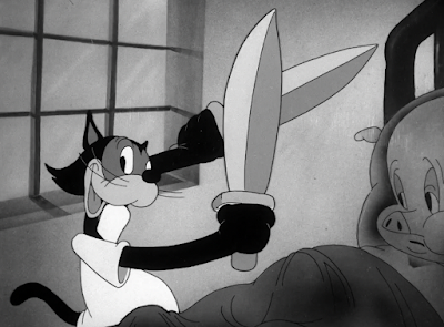 Comparisons to the short’s unofficial predecessor become more significant with Porky in the clutches of the cat. Both Daffy and the cat have the same motivation, as revealed through a song number courtesy of The Rhythmettes: both want to perform surgery on an unwilling Porky.