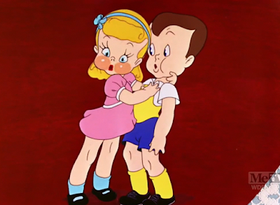 …who accepts it as the overzealous Casanova he is. Animation and vocals are harmonious in creating a joyous amalgam of utter creepy sleaze; Blanc, again supplying the velvety voice of a fully-grown man’s injects a sincerity in the passionate vocals. The joke being, of course, that Tommy’s means of romancing are much more “advanced” than the ho-humming of a typical school-hood romance (though his performance teeters on animalistic if anything.