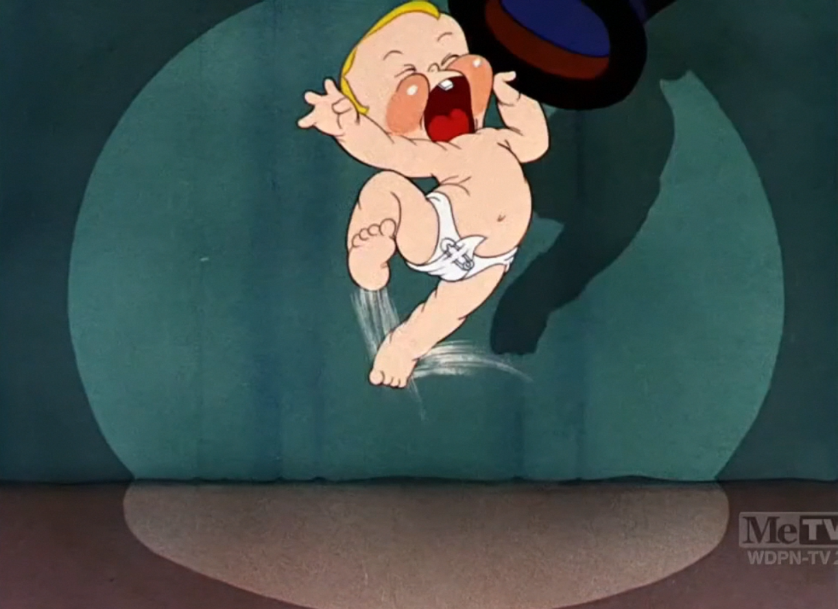 Expertly crafted cloying exposition proves to be functional, too—an innocent antithesis is constructed against the raucous, brazen, certifiably adult strains of Mel Blanc emanating out of the tyke’s mouth as he rings in the new year. Not only does having the baby cavort by standing on his legs provide more room to move, enunciating the hysterics needed to cement a visible switch in demeanor, it also represents a metaphorical shift to manhood. “Manhood” used liberally, in the same way that the grown timbre of Blanc coming out of the baby’s mouth represents “manhood”. The baby is already human, so describing the change as a sudden burst of anthropomorphism seems redundant, but is nevertheless somewhat truthful as the range for acting and hysteria is expanded.