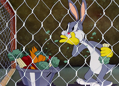 Staging is essential to the scene as well. An overlay of chicken wire bestows credibility to Bugs’ dissatisfaction by appearing to close him in; it’s claustrophobic, intended to be distracted. With the viewer looking in from the outside, it’s as though they’re viewing a zoo exhibition. All aspects unkind to Bugs’ ego, which he enunciates in his angry, grumbling rant.