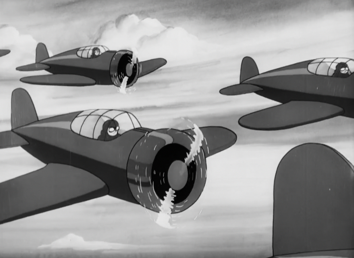 Two interceptor planes fighting with each other like dogs is the strongest highlight of the three. Not necessarily due to the content of the gag itself, but what it represents—in the same way the jellyfish is a throwback to earlier Clampett, so is this gag. The planes circling each other and barking like dogs, nondescript star effects and brush lines seeking to caricature and specify the action, is particularly reminiscent of a cat-dog hybrid fighting with itself in Clampett’s opus, Porky in Wackyland. Here, the gag feels more like an approximation—motion is less smooth, action is less clear, with graphic flourishes and sound effects carrying more weight than the actual drawings, but it too feels like a genuine product from the mind of Clampett. Even if it’s not riotous or intensely engaging, it does feel at home.