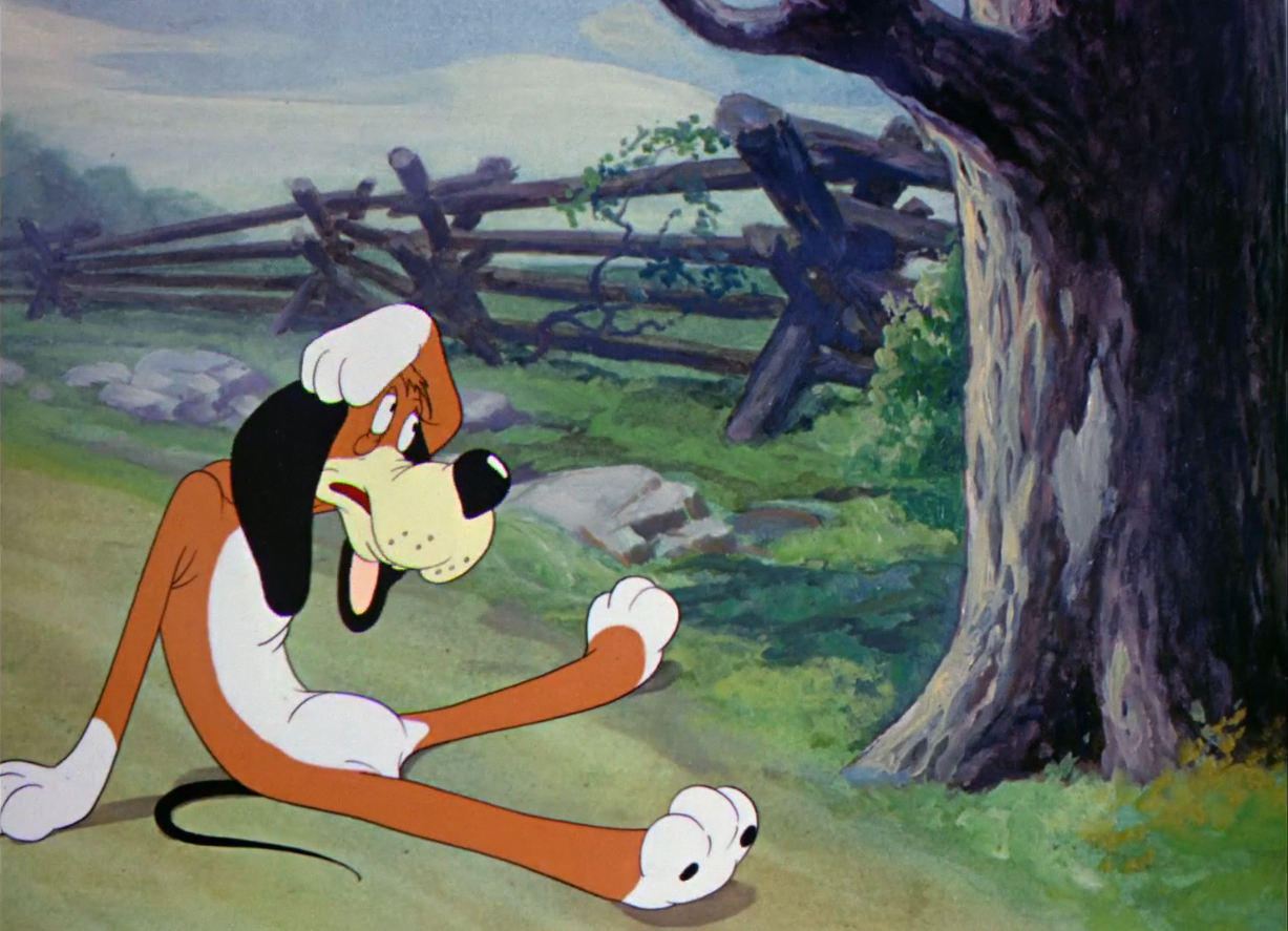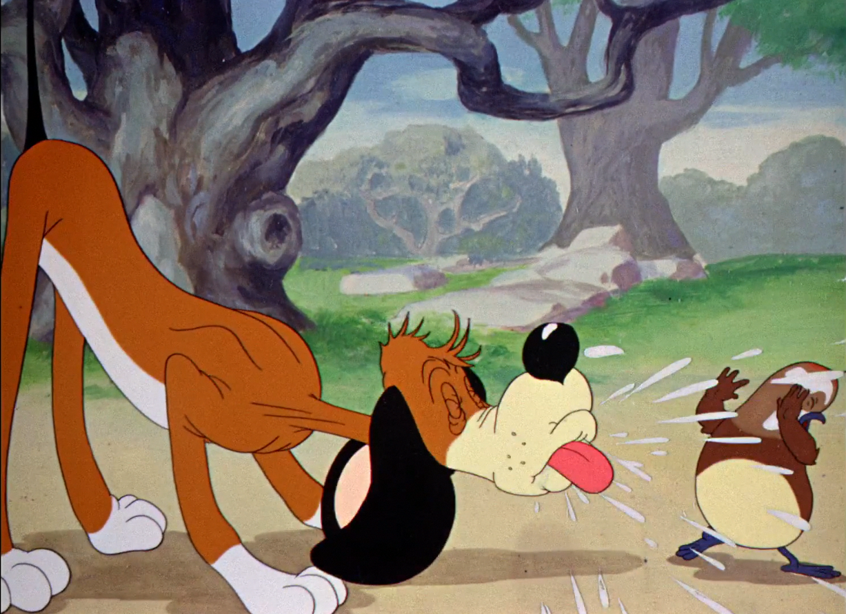 Quail tracks on the ground serve a greater purpose than a mere visual guide. Rather, they kickstart a visual gag of Willoughby’s nose and muzzle distorting to match the equally incomprehensible pattern of the tracks widening and tapering again. While nothing particularly special, the execution is plenty steady and fun—Willoughby’s unwavering call to duty is what makes it so amusing. No self aware japes regarding the distortion of his muzzle or confusion following the bird’s trail.