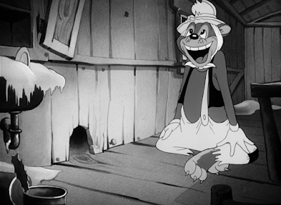 When thinking of this cartoon, the first thing that comes to my mind (outside of the brilliance of Blanc’s deliveries as the bear sobs and laughs hysterically, or Porky’s endearing decision to quote Pinnochio of all things for his argument) are the parallels. Parallels between Porky’s tidy farmhouse and the bear’s ramshackle abode. Parallels with how the camera dissolves from the bear’s house to Porky’s as the bear is pursuing the dog. Parallels between the bear’s hungry, contended expression and the dog’s fear versus their enticement as they catch wind of Porky’s sumptuous meal. It is a cartoon of contrasts—the discrepancies are exceedingly clear, coherent, allowing the audience to follow the story and motives of the characters clearly. Yet, such clear indication of these antitheses don’t feel belittling or insulting through their clarity. Freleng manages to turn this sort of symmetry into a rhythm, a natural rhythm that keeps the cartoon flowing and the audience engaged.