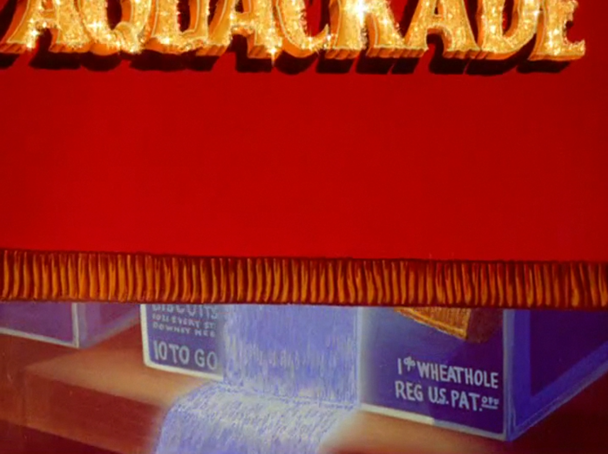 The source of the Aquacade stems from a box of shredded wheat, whose waterfall supplements the coming antics. A few layers dominate this seemingly innocuous shot of the wheat; it mainly serves as a riff on Nabisco’s shredded wheat boxes, whose slogan of “The Original Niagara Falls Product” often found its box art coupled with the aforementioned waterfalls. However, its name in the cartoon here is a bit of a stretch—“U-Know Biscuits” tips its hat to Uneeda Biscuit, which was also a product of Nabisco.