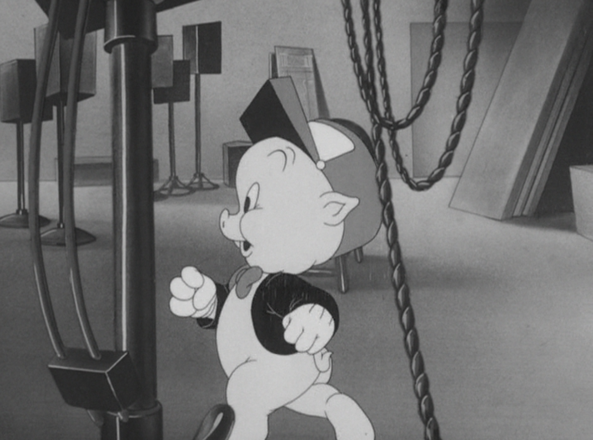 Formal introduction of the cartoon is a bit more humble in comparison to its opening—such is exactly the point. Manning the switchboard and shutting off all the appropriate lights, our perky theater manager bridges the gap between the titles by singing his own accompaniment of “Pictures”. Attuned ears will note that Porky’s orations are in the key of B#, whereas Stalling’s musical accompaniment of the same song is in C. Such concocts a slight dissonance that first registers as asynchronous and out of tune to the audience.