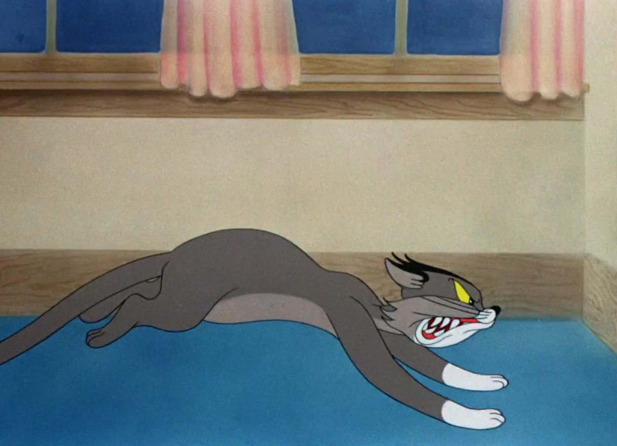 Any mouth diving is of course temporary, and instead results in more cat abuse. It’s worth noting that Bob Clampett would reuse both the tongue-as-curtain-flaps gag and the idea of a bird briefly abusing a cat’s tongue—knowingly or otherwise—for his own personal gain. Falling Hare and Birdy of the Beast give their regards respectively.