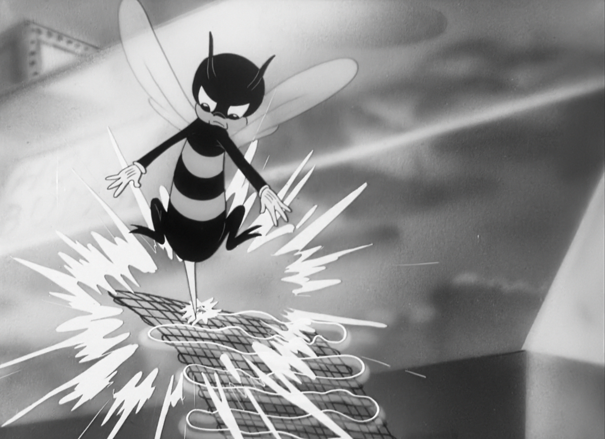 Confusing as electrifying a doorknob out of a door may be, pertaining to the opening, Freleng does deserve credit for sticking with that same abstraction. The bee’s sting is embodied as an electrical charge, conducted through the fly swatter and prompting some rather amusing drawings of a fried pork. One frame in particular has his eyes still visible amidst the shockwaves completely dominating his body; the eyes are the window into the (cartoon) soul, and this detail, no matter how significant, does evoke sympathy on Porky’s behalf. A brief glimpse of humanization. Something that may be hard to do when a character is completely reduced to white jagged lines on screen.