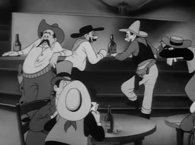 Thus, Saps in Chaps marks Friz Freleng's final foray into black and white (his Private SNAFU cartoons for the government not withstanding.) Freleng's first directorial stint in the '30s saw him adopting the senior unit of the studio, rarely mingling with the black and white Looney Tunes; thus, the transition to full color isn't as momentous as it may be to someone like Bob Clampett, who exclusively directed black and white cartoons for the first four years of his career, but it certainly is a shift worth noting.