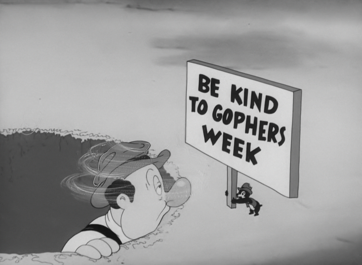 Coming off of the exceptionally middling Hobby Horse Laffs, Norm McCabe and his team fare better with their Gopher Goofy. It does warrant stressing the “freedom” of this short’s existence: Porky has been absent from the Looney Tunes series for months now, last seen in February’s Porky’s CafĂ©. The porcine boundary has been broken.