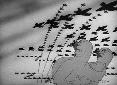Thus, in a bit of a subversion, it’s the dog who declares the blackout rather than an air raid warden narrator. Likewise, his screams of “BLACKOUT! BLACK-OOOOUUUUT!” are likely the most jubilant anyone has ever been in declaring a blackout. Yet again, his animation seems to pulsate and writhe with newfound energy, springing up with a sudden elasticity.