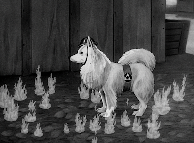 Nevertheless, Clampett compensates through the heart of the gag itself: the dog putting out the flames with his spitting. Lobs of spit are rubbery and obtuse for clarity. They arc and fly out in varying directions, encouraging visual interest--the same is true for some lobs of spit being fired in succession in the same direction, others only extinguishing a flame in one fell swoop. Sound designer Treg Brown brilliantly connotes a necessary whimsy through his own rubbery spitting sounds. While not the first nor even most clever use of the Spitz pun, the actual animation of his spitting is lively and attempts to compensate for the aforementioned weaknesses.