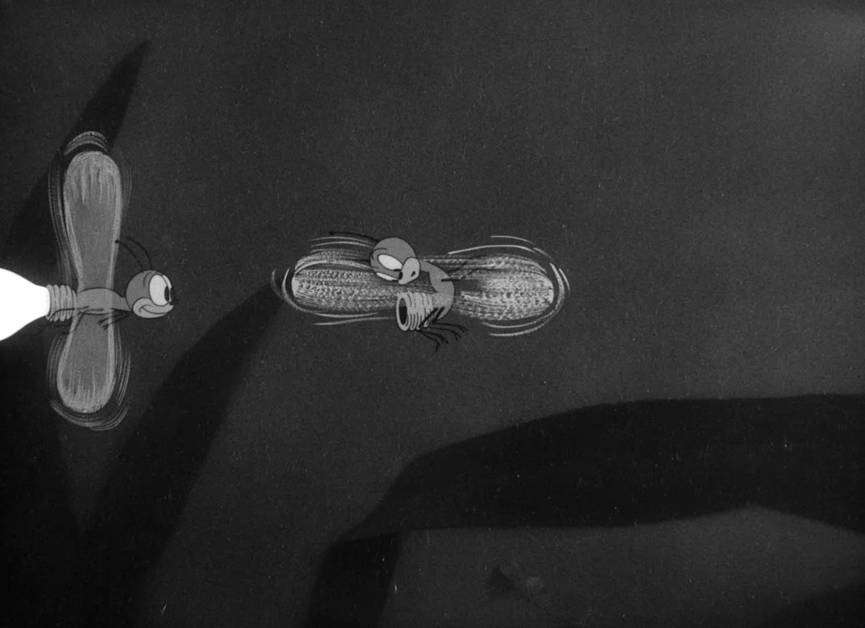 Cleverly, both he and the firefly succeeding him land on a conveniently available leaf--that way, the camera doesn't have to keep trucking along, prompting further expenditure of pencil mileage and money mileage. Cleverness is instilled through the framing, as this succeeding firefly--seemingly included to fill out the frame, offering a juxtaposition between a firefly with a bulb and one without--is the bulb snatcher in question. The same juvenile glee expatiated about in the cartoon's open can be found in the culprit's sheepish return of the bulb; his wide, disingenuous but rather pleasurable grin has a real schoolboy innocence to it that Clampett was so strong at harnessing.