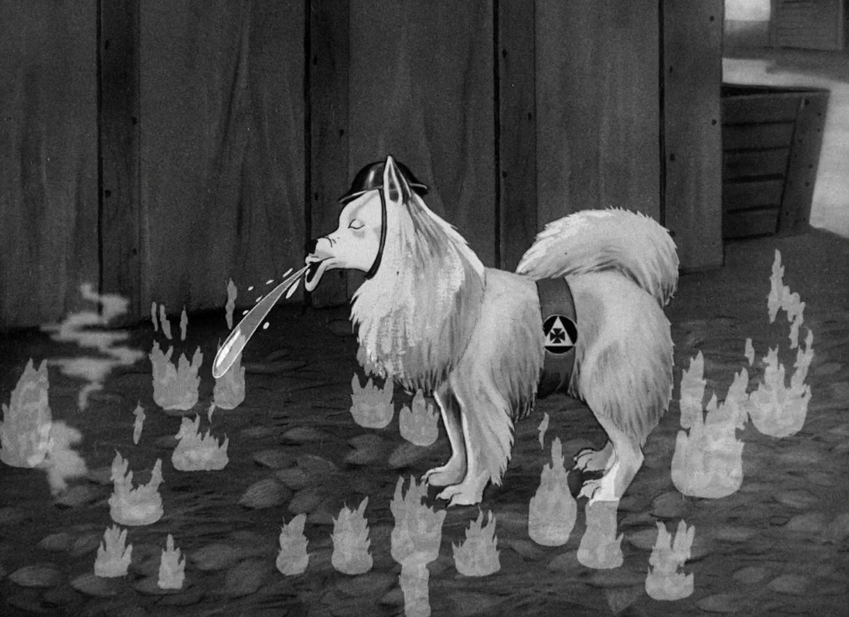 Likely, these designs were a way to "ease in" to the cartoon. Start off with the realistic, chiseled designs, and slowly devolve into the normalcy of lunacy as the cartoon progresses. Of course, another benefit of doing so is, again, economy. It's easier to only animate the dog's mouth in the close-up of him putting out the fire ("a full-blooded Spitz" being the punny explanation for his peculiar means of extinguishing fires) and keep the rest of his body on a rigid, unmoving, independent layer in the name of realism.
