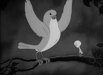 Clampett, having a genuine penchant for cute critters (even--and perhaps especially--if the intent can be sarcastic), capitalizes upon this saccharinity. When Mama asks for the baby's confirmation of his understanding, the baby shakes his head no in an echo of shorts such as Wise Quacks. Both feature a baby bird--of varying degrees of cuteness--that set the audience up to obey to a predetermined saccharinity, only instead to subvert expectations at the last second.