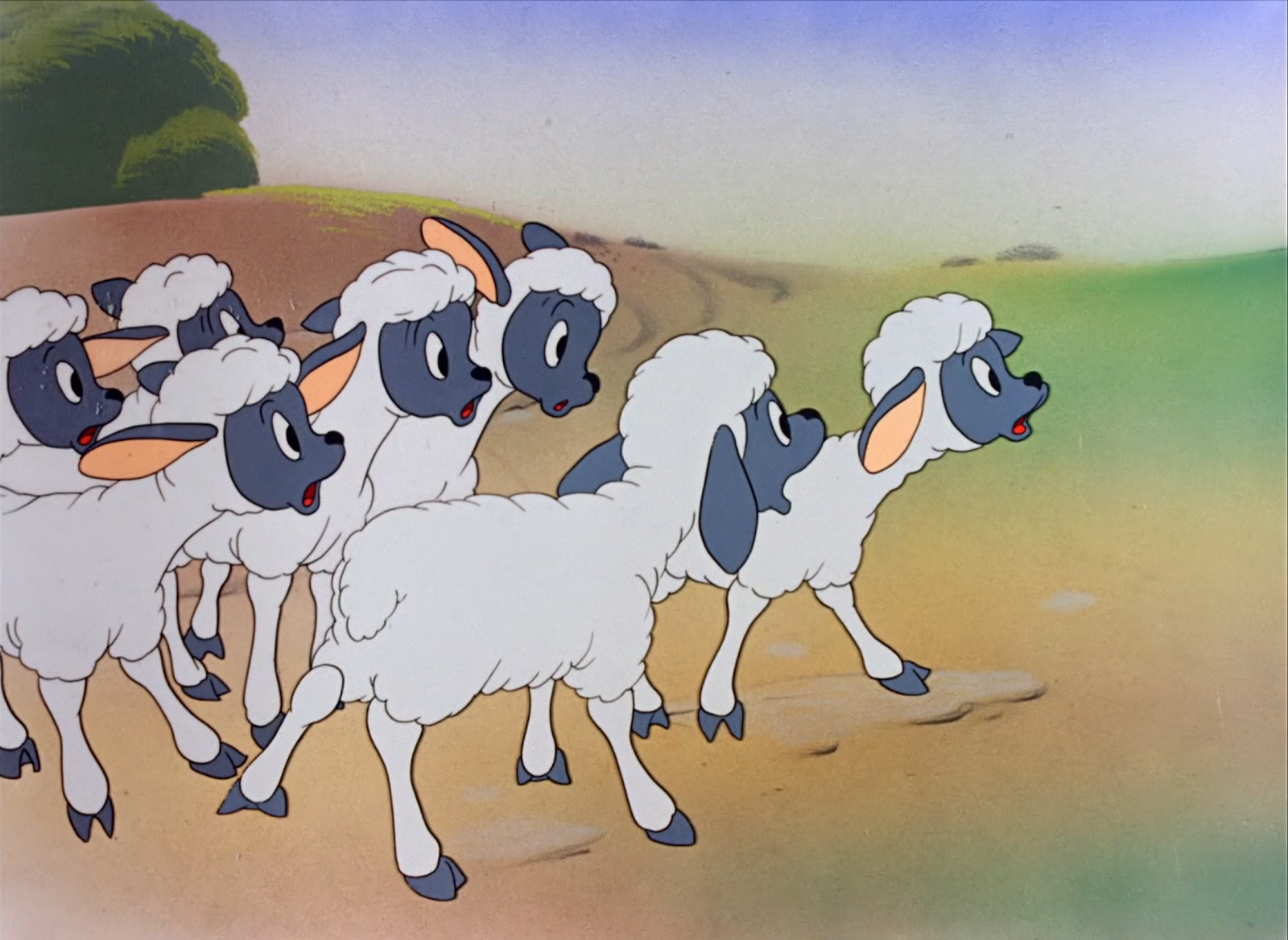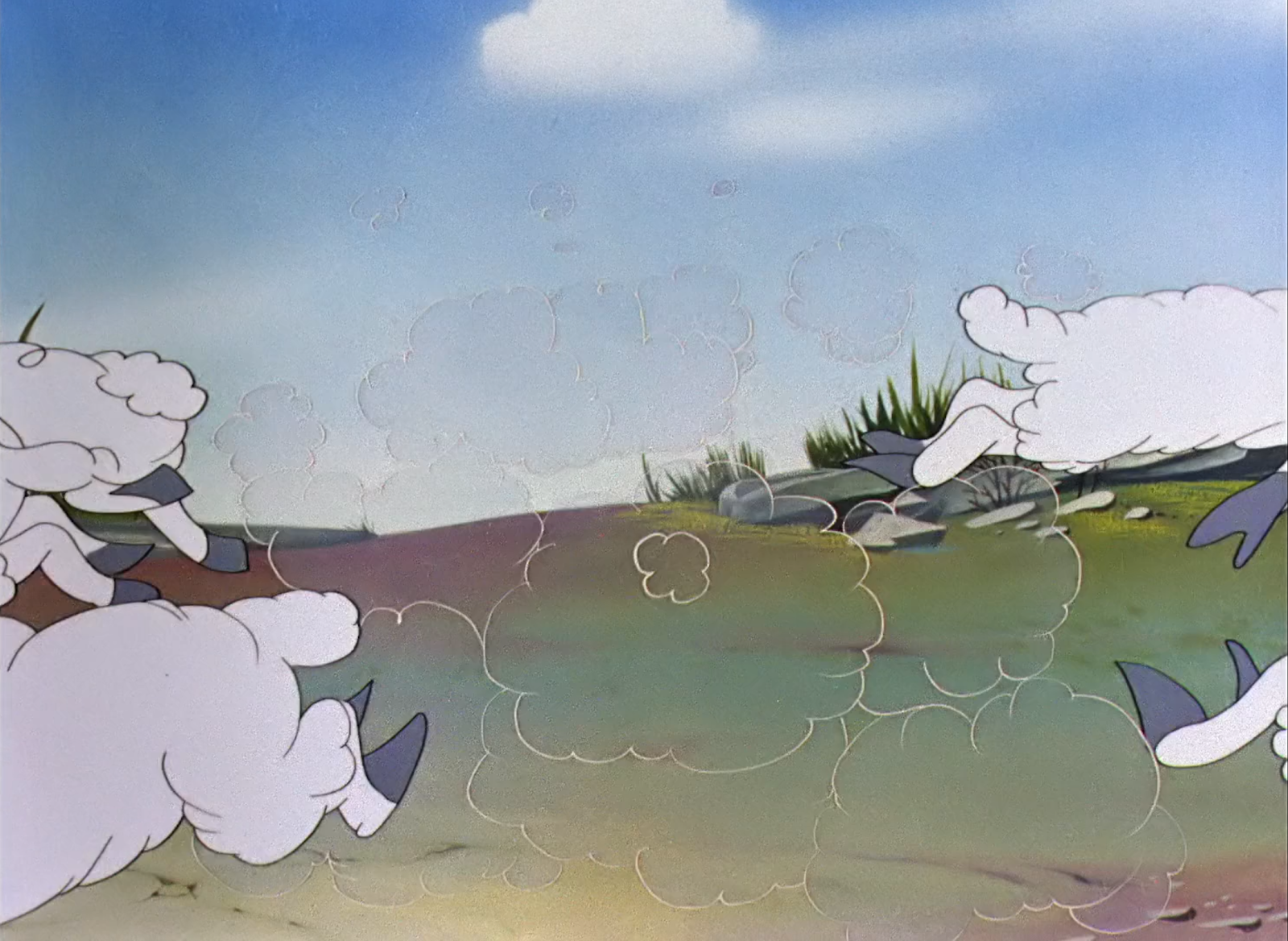 Another solid source of appeal throughout the cartoon is its color design. The harsh red of the barn juxtaposes boldly against the teal skies, almost verging on a complementary scheme with the slight tint of green to the skies. Fluffy, white clouds make the strong red values of the barn or the deep burgundys of the nest and windmill pop out even more--a very color conscious shot.