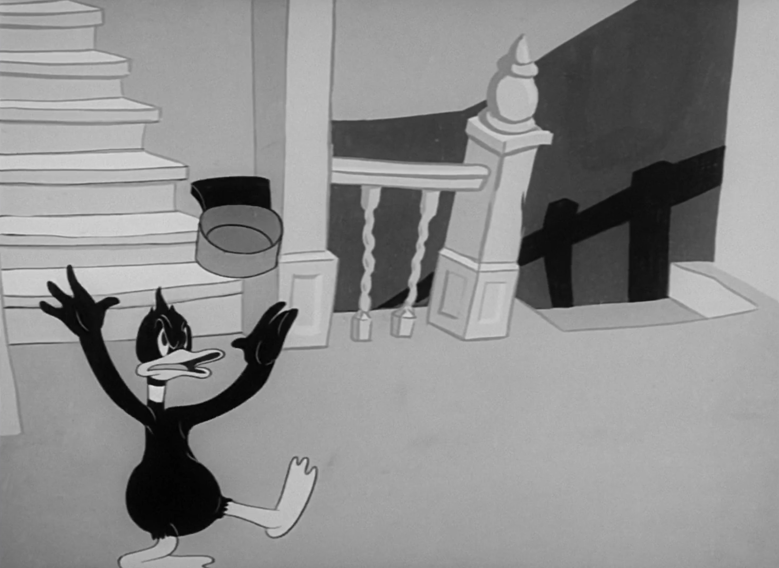 All of the above extends to the door slowly creaking behind him, which prompts Daffy to share a slightly restrained, slightly curious, largely nonplussed glance.
